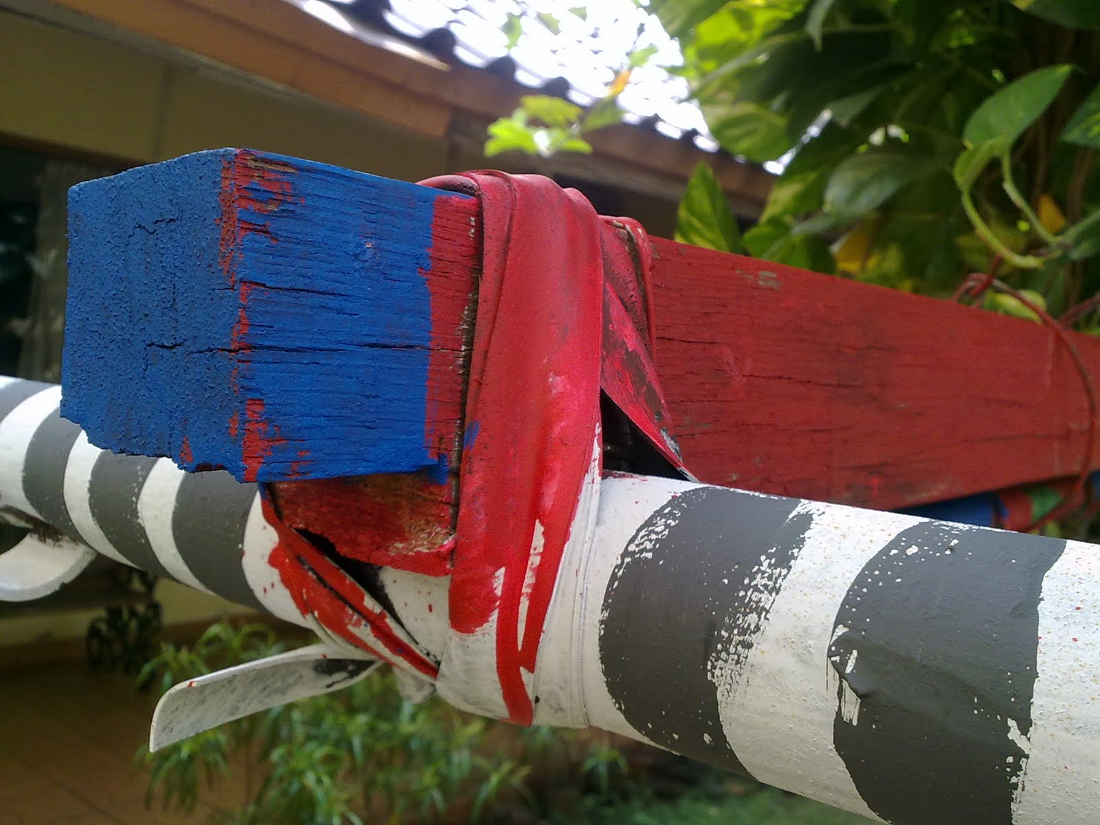 ... my son, age 2, loves to superheroes.Spiderman he calls 'bambang' (until now, we do not know what it means). In honor of 'bambang' and make my son happy, I make kids swing from the thrift: scrap metal, wooden chairs former kindergarten, wood and rubber tires. We attach the swing this kid in the backyard. Then last given a touch, painted bright colors and the face of the 'bambang'. In the former chair of wood, I wrote: 'the guilty one'.